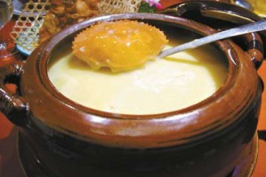 Major features of Cantonese cuisine: good at steaming, braising, frying, baking skills; stressing that dishes should be fresh, tender, crisp or smooth; tastes are mainly raw, crisp, fresh and thin; clear but not tasteless, fresh but not strong, tender but not half-cooked, oily but not too greasy; stressing the use of strong fire to cook to get full tastes and flavors. Cantonese food features over one hundred of famous dishes, e.g. Baked Suckling Pig, Longhudou (battle between dragon and tiger) and Taiye Chicken (County Magistrate Chicken), etc.